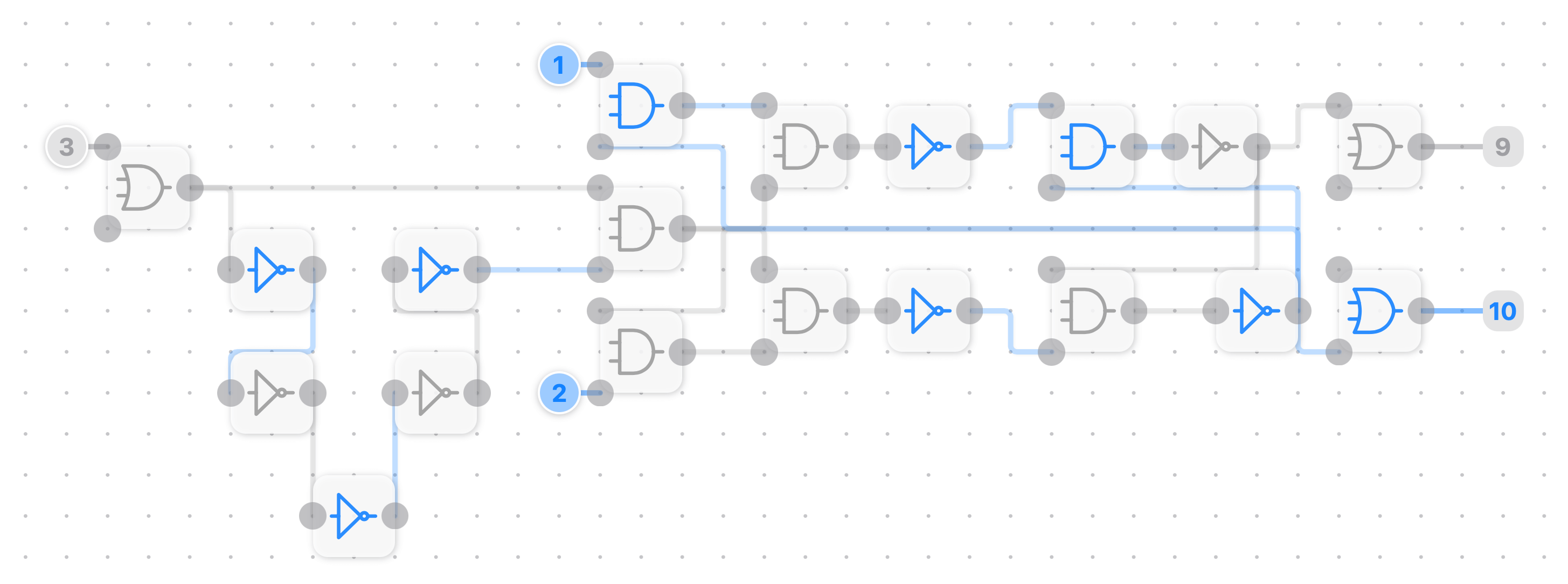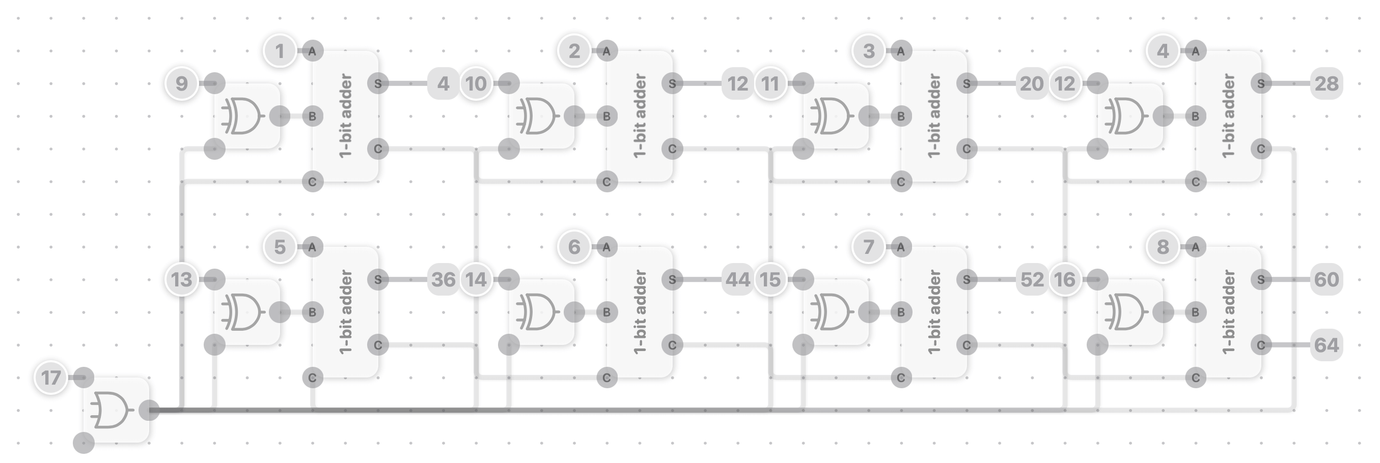 Below demonstrated how to assemble 1-bit adders to an ALU. The Input-17 is a subtraction indicator. The Output-64 is a flag.